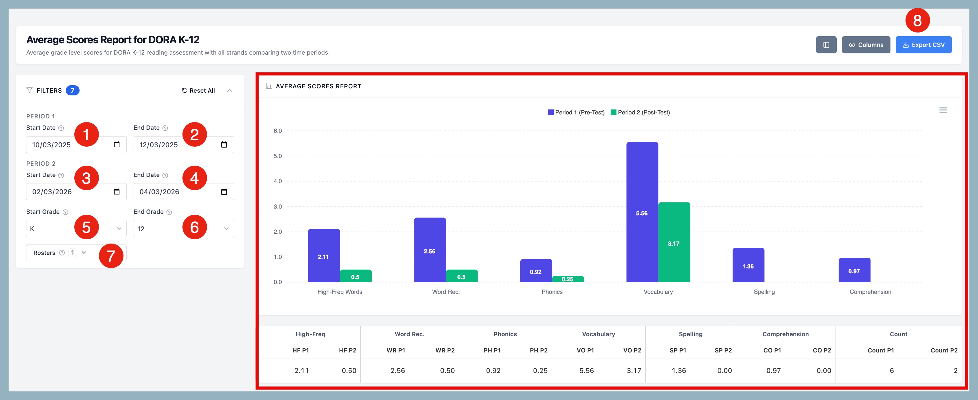 The Average Scores Report provides the average grade level scores with all strands comparing two time periods.