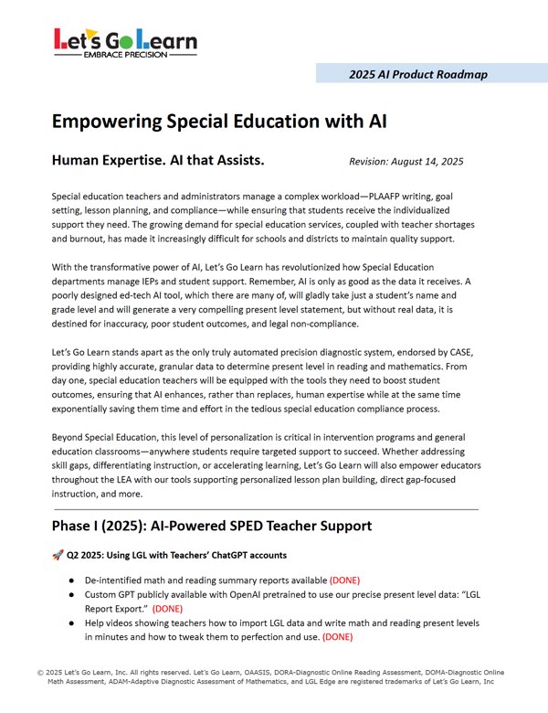 Product roadmap for Let's Go Learn's AI strategy for 2025 and beyond.  We've hit most of our targets before our original deadlines.