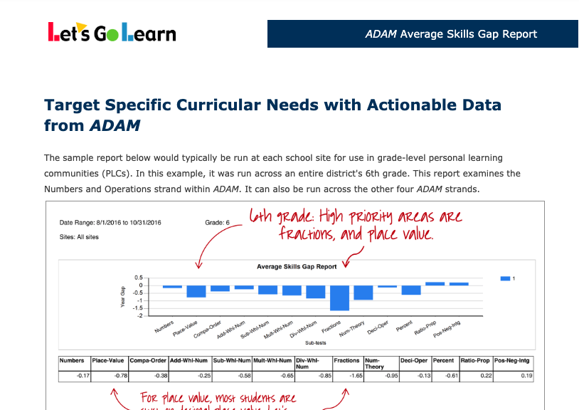 The sample report shows average skills gaps for 6th graders across numbers and operations within ADAM. The piece has a sample report from the start of the year, as well as mid-year.