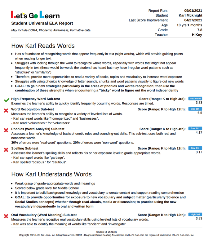 This 18-page report provides a sample of what the parent of an eighth-grade student would see with the optional recommendations turned on. It includes a breakdown of the student's reading profile, a narrative report, an analysis of responses, and specifications about the assessment itself.