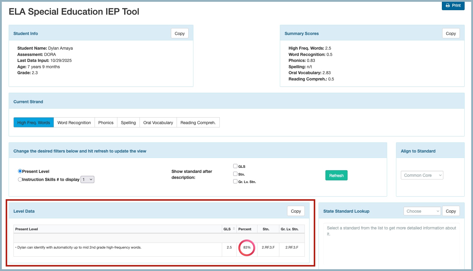 In the Present Level section, you can find the student's precent level score in percentages under the column "Percent".