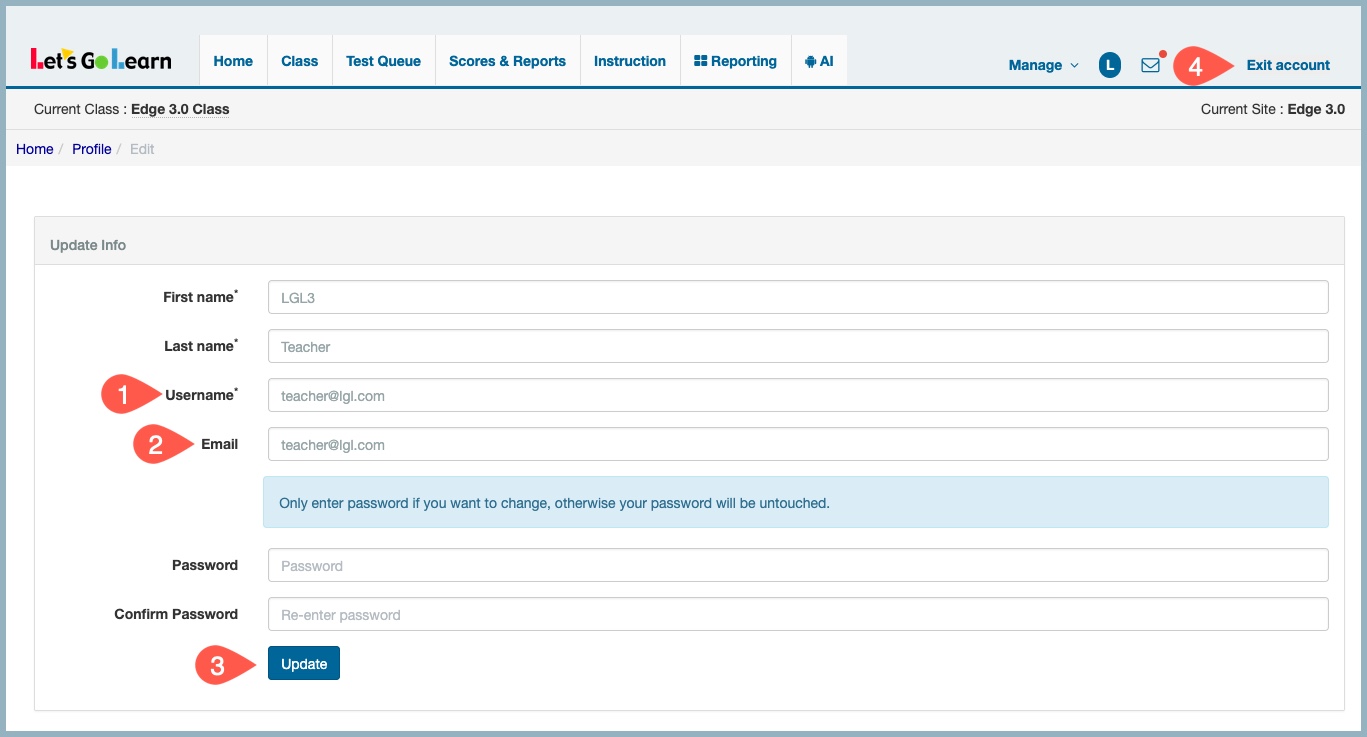 To edit a teacher's Username or Email from your Admin account, you will first need to log into their teacher's account to make the changes.Here are the directions below.